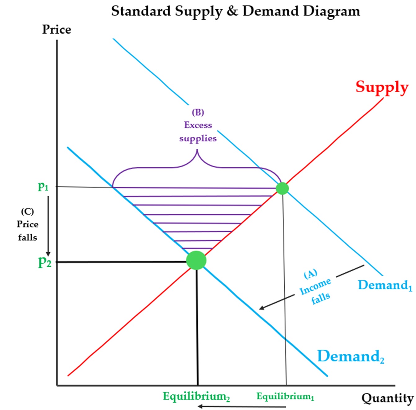 Third, Marx briefly alludes to a point he developed more fully later in this chapter and elsewhere: “the relation of demand and supply” (i.e., excess demand, excess supply, or equilibrium of demand and supply) explains only whether a good’s price will rise, fall, or remain unchanged. It cannot explain the level of the price itself. That is, it cannot explain why the price changes from p1 in one equilibrium situation to p2 in a different one, instead of changing from p1 + x to p2 – y. Once again, neoclassical economics agrees: a change in one or more determinants of demand or supply, not the state of imbalance or balance between demand and supply, is what explains why the price changes from p1 to p2 (see Figure 1, a standard supply-and-demand diagram).