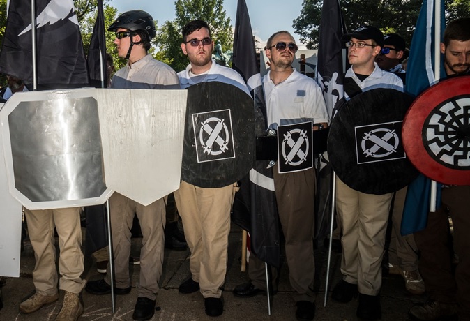 The domestic terrorist who drove the car was James Alex Fields, a 20-year-old, openly neo-Nazi, man from Ohio. He was not a lone nut; he had been seen earlier in the day marching in one of the neo-Nazi contingents, wearing its uniform, and bearing its shield (see photo below). After the murder, Fields was arrested and charged with second-degree murder.